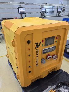 The RoyPow Power Store. units are Lithium-ion battery storage systems that contain everything to be used straight away. They contain a high quality hybrid power inverter that is capable of a 8 kVA continuous output. It has a fast recharge for all outputs and multiple capacities to suit different power usages. The equipment has no emissions or noise when in use and can be coupled with a generator or charged via the grid or a renewable resource. Each unit also features a battery managment (BMS) and energy managment (EMS) system that can report on use, state of charge (SOC) and relay data on use and cost savings. The BMS offers information on the batteries and state of health to ensure optimal charge and long life expectancy. Maintanence is minimal with good protection, transportation and storage. Each Power Store. has a steel powder coated canopy that is rated to IP54 and its internal components are rated to IP65. It has a LCD display incoporating the EMS panel to allow the user to fault find and much more.